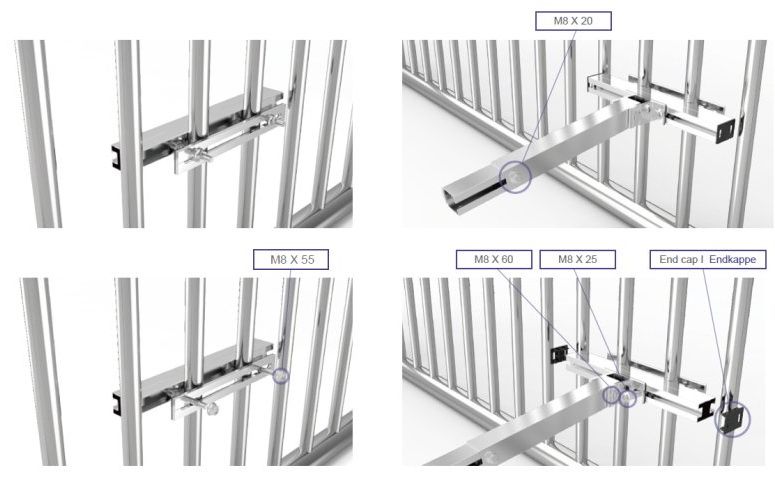 Lieferumfang: 2 x Haltebügel für Geländer (Rundrohr), 2 x Endwinkel mit Schraube & Mutter, 2 x Stütze verstellbar mit Befestigungsmaterial, 2 x PV-Schiene, komplettes Befestigungsmaterial